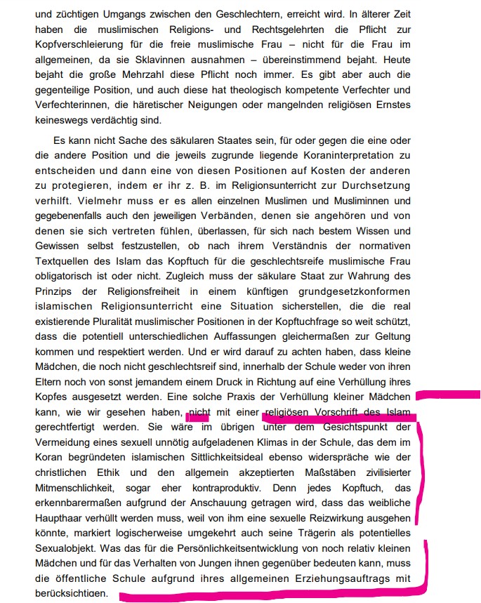 dort wird ausführlich festgelegt, das Kopftuch bei Musliminen ist keine religiöse Vorschrift sondern nur Tradition von Männern mit niedrigem IQ………